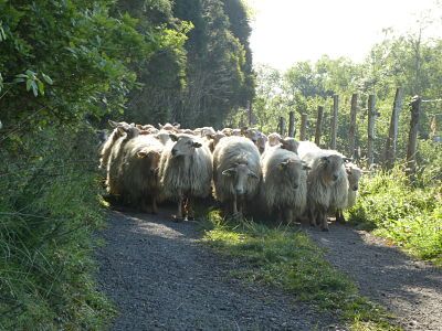 El escenario ha cambiado y el caminante, a pie de monte, salvará sucesivamente grandes prados donde pastan diferentes cabezas de ganado, con preciosas vistas hacia el Sur. Se cruzan pequeños barrancos y regatas en un suave diente de sierra, el caserío Bonatxo hasta llegar al catalogado Amezti, del siglo XIX, (con panel explicativo por su valor) y que se dedicaba a la actividad del pastoreo, oficio muy arraigado en Jaizkibel. Tras la cantera de arena cancelada “Sarastizabal”, el camino natural en ocasiones estrecho y siempre bien “balizado” en los cruces llega a una zona empedrada. Es la calzada de Olazar, que servía para transportar los troncos de robles destinados a la construcción naval.