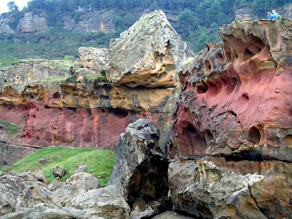 Con el sonido del riachuelo Gastarrotz a nuestra derecha seguían apareciendo cavidades, más formas y más dibujos hasta que tras superar un pequeño y peligroso caos de rocas, llegamos a la espectacular “ Catedral de Jaizkibel “ en la playa de las gaviotas, playa roja de Gastarrotz, a la que solo con mareas bajas se puede acceder.