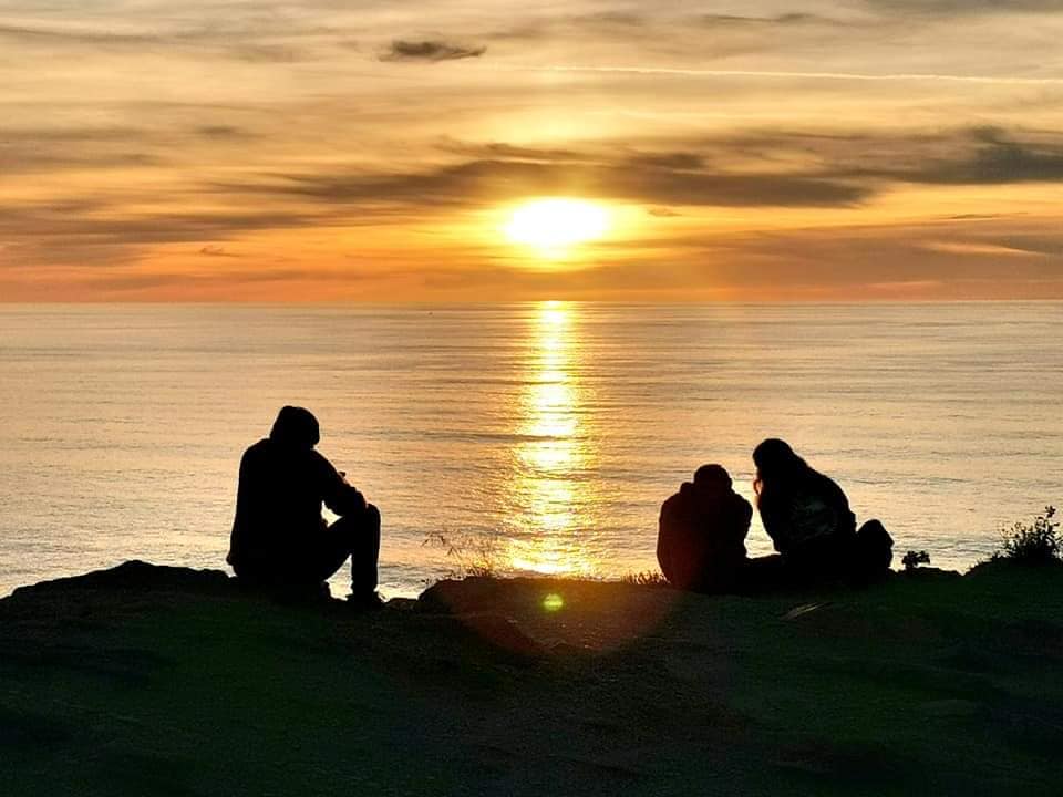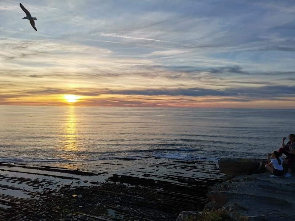 Siempre recordaré aquel día que viniendo por autopista desde Soustons, en Las Landas, intuí un atardecer de colores. Tomé la desviación oportuna para seguir por esta misma costa el trayecto que me quedaba hasta Donosti y llegué al mirador justo diez minutos antes del ocaso. Caravanas, coches y motos aparcadas ya anunciaban que no iba a ser el único en disfrutar de este privilegio de la naturaleza. Pequeñas nubes blancas y otras en forma de fino velo cubrían el cielo; el sol, ya naranja fuerte, desprendía por el mar su manto de lucecitas que de menos a más llegaban hasta el acantilado, que cambió su color por el dorado y luego por el plateado. Un velero vino a posarse en medio de ese camino cósmico, mientras las gaviotas se dejaban balancear rozando la cabeza de los curiosos, como si ellas también quisieran ser partícipes de esa danza de los enamorados. Varias parejas se abrazaban sentadas en las rocas, y atrapé a una de ellas en mi cámara como dos siluetas negras con el sol de fondo.
