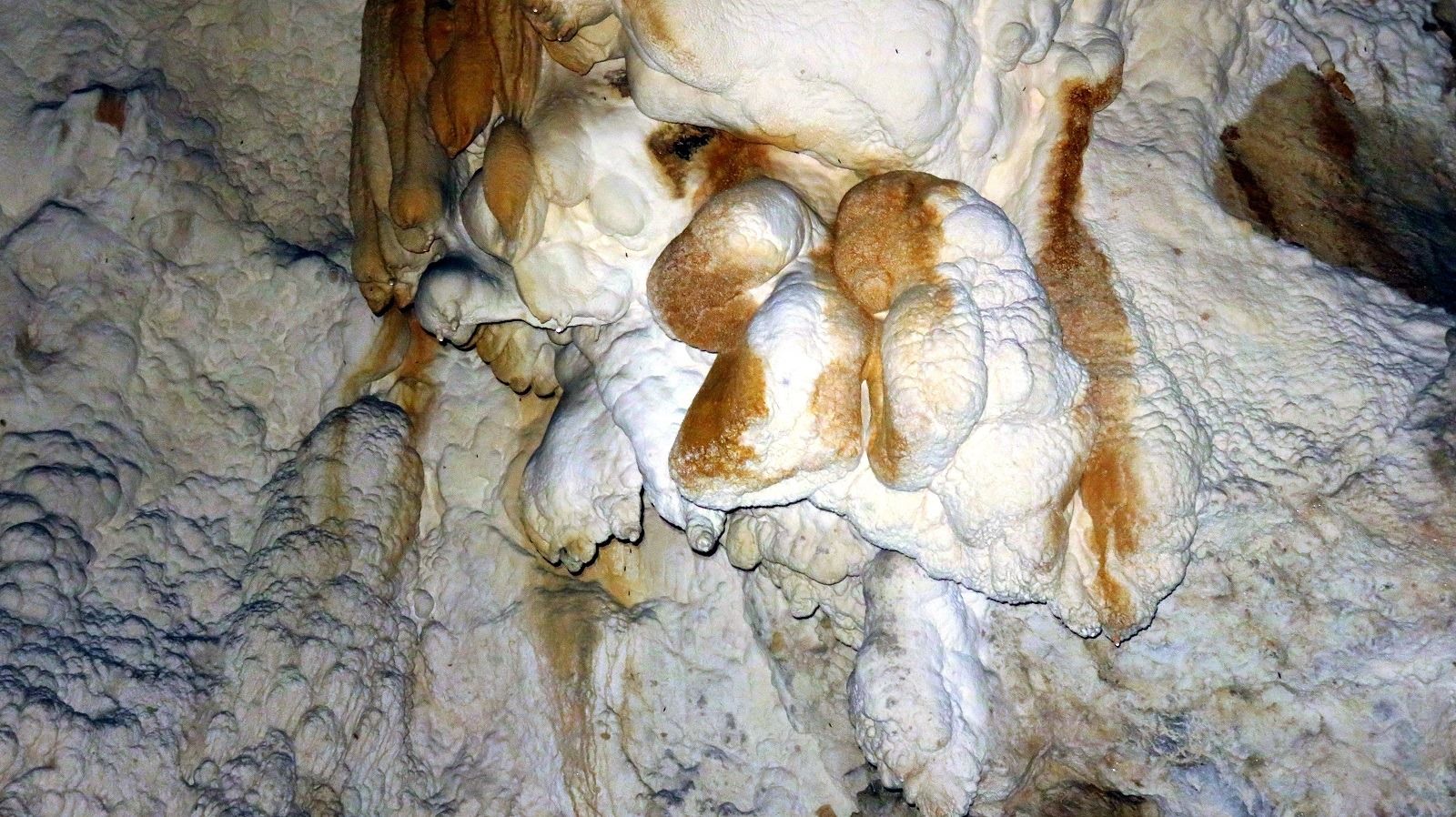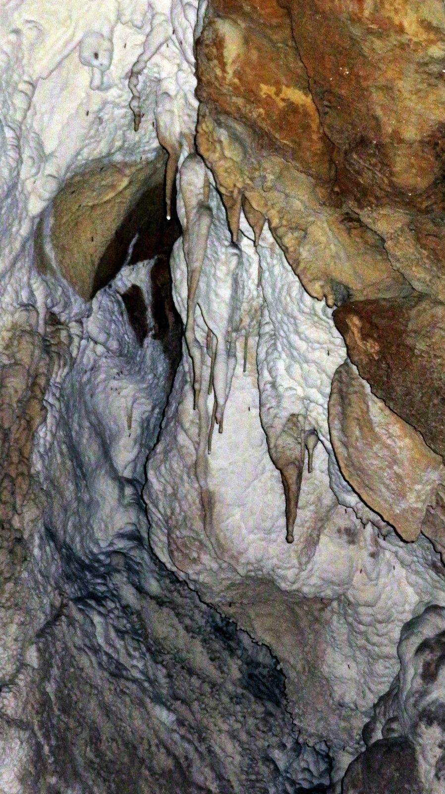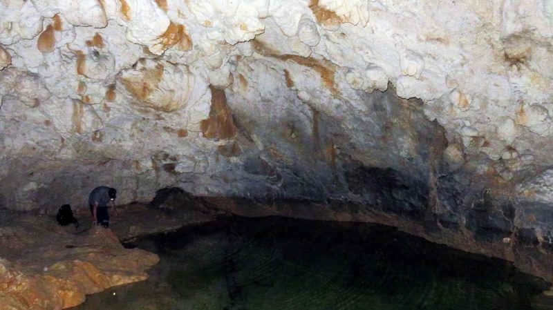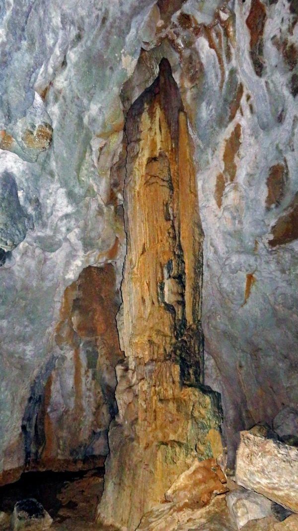 Con cuidado pasamos al interior y a través de un caos de rocas muy resbaladizas enseguida comprobamos que la Dama dormía dejando ver una enorme columna geológica, unión de estalactita y estalagmita que prácticamente tocaba el techo. Bellísima. Más abajo de esta especie de salón recibidor, un estanque coronado por una bóveda llena de curiosas formaciones y que conecta con la salida ( evitamos riesgos ) al otro lado de la cima. Dicen que quien la pasa encuentra las pieles de oro de la Dama.