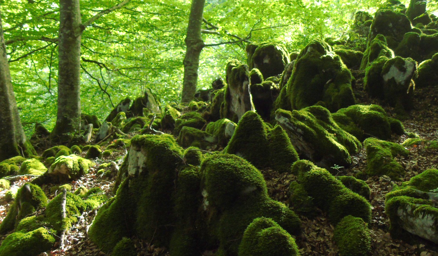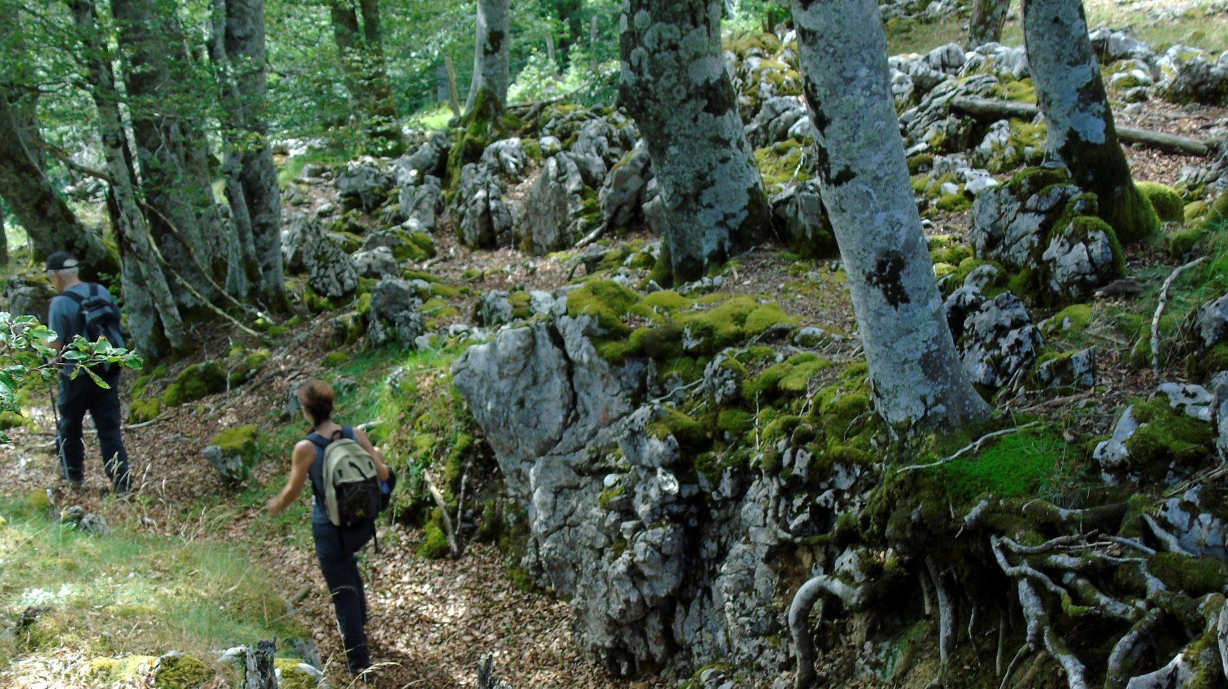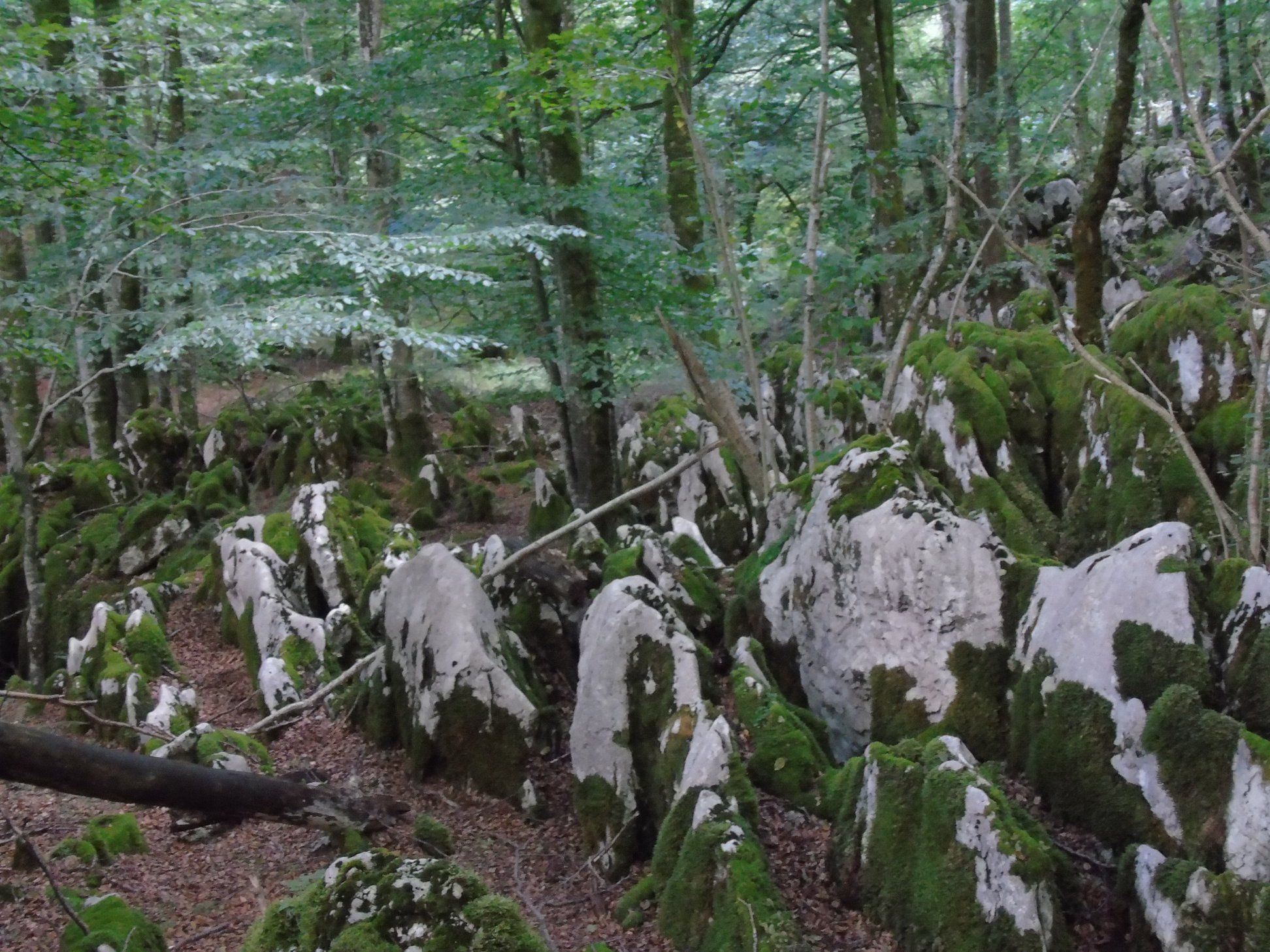 Desde Lizarrusti junto a su albergue, oficina de información de Aralar y parque de recreo, salía el empinado sendero que nos empezó a mostrar ese paisaje kárstico tan característico de Aralar. Surgencias calcáreas se mezclaban con el bosque cubiertas de musgo. Por momentos, rincones de enorme belleza, muy cerca de la salida, que invitan a cualquiera a pasar un buen rato de relajación.