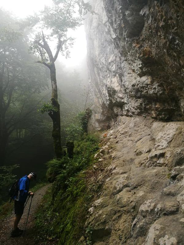 De la cumbre de Lizarrusti ( 622 metros ), una vez pasado Ataun, y de nuevo con el albergue, centro de interpretación y restaurante (muy recomendable por cierto ), partimos siguiendo las indicaciones de Lareo. Un breve camino llano a través del bosque nos llevó a pasar hasta tres grandes y muy visibles paredes de caliza, la segunda de ellas equipada para la escalada y la tercera con un pasamanos que pocos utilizarán por ser camino seguro, aunque el barranco en el otro lado pueda llegar a dar algo de vértigo.