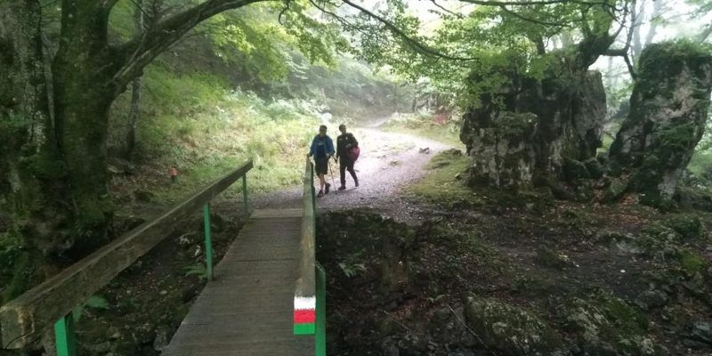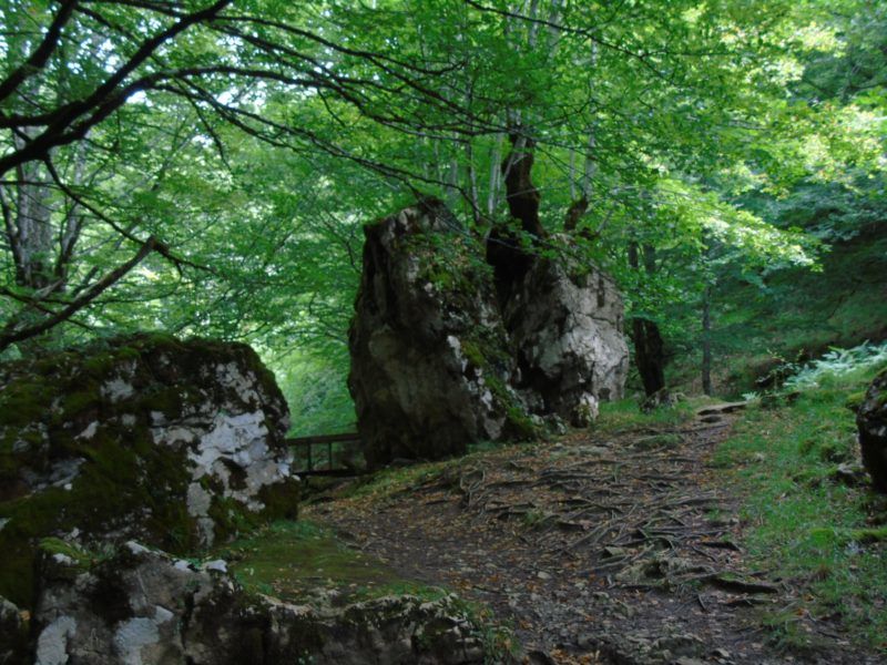 En apenas 40 minutos alcanzamos uno de los lugares más mágicos y recomendables, un pequeño rincón sacado de cuento de fantasías, con varias rocas verticales muy curiosas, cubiertas de musgo, con un puentecito y las saltarinas aguas del riachuelo Agauntza. Merece el rincón una parada y algo más observar a las lamias, seres mitológicos que viven en los ríos de esta zona, bellas damas que peinan en las orillas sus cabellos con peines dorados. Observa, pero ni se te ocurra quitarles el peine. Akerreta se llama este rincón lleno de encanto.
