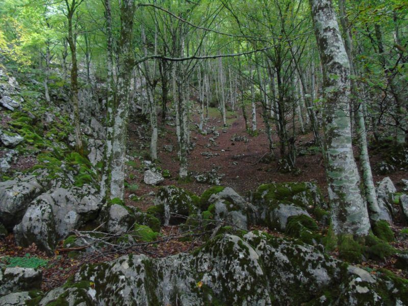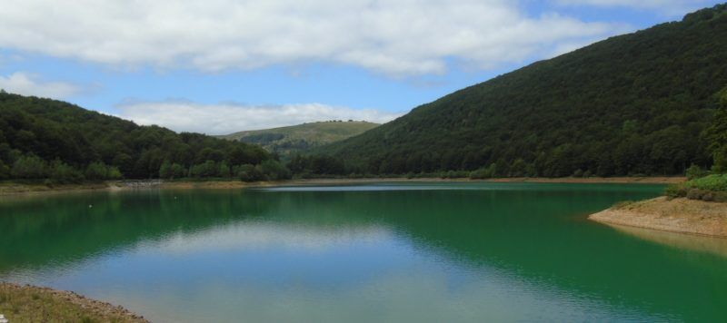 Por la izquierda bordeamos el embalse hasta encontrar al fondo las indicaciones de Aralarko Bira, Ataun, por el GR-20. Entramos en la senda que sube ahora con descaro siempre en un extenso bosque de hayas, disfrutando de la tranquilidad de la montaña, de algún tejo muy visible y de las formas curiosas que llegan a adoptar las hayas, alguna de las cuales saca sus raíces por el camino. Algún silbido escuchamos, posiblemente, ya puestos, de algún Basajaun, cuidador de los bosques, que obviamente nos dio más tranquilidad. Estos seres son absolutamente amables.
