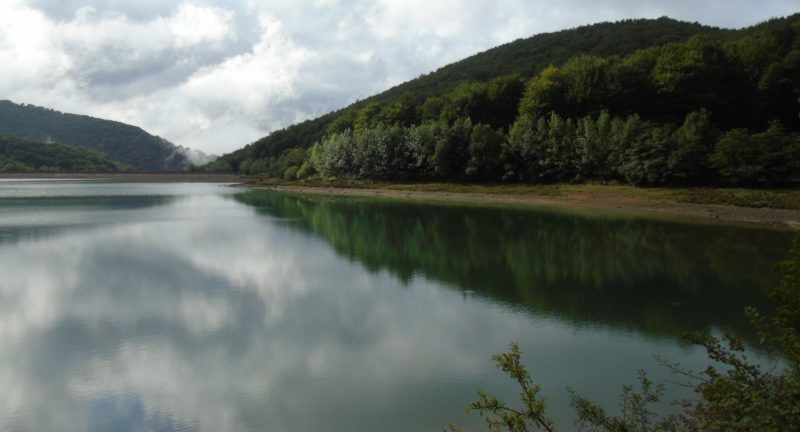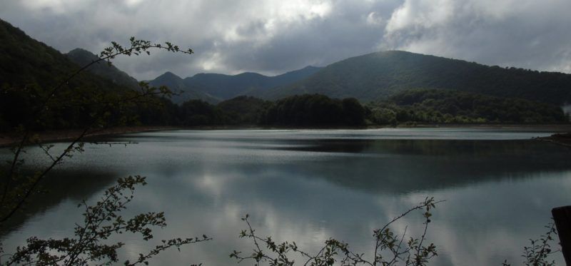 Tras pasar este rincón llegamos a una breve pista asfaltada que hay que subir y que conecta, tras otro breve paso bajo las hayas tan esbeltas que casi es imposible ver el cielo, con el bello embalse de Lareo que nos recibió con algo de niebla.