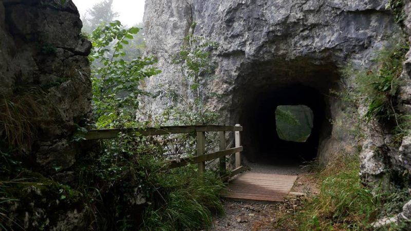 Tras pasar una pequeña cueva de apenas cincuenta metros llegará el caminante a la antigua cantera, visible a la derecha del sendero, con la que se construyó el embalse de Lareo. Un par de repechos entre la espesura del bosque nos llevó hasta este lugar.