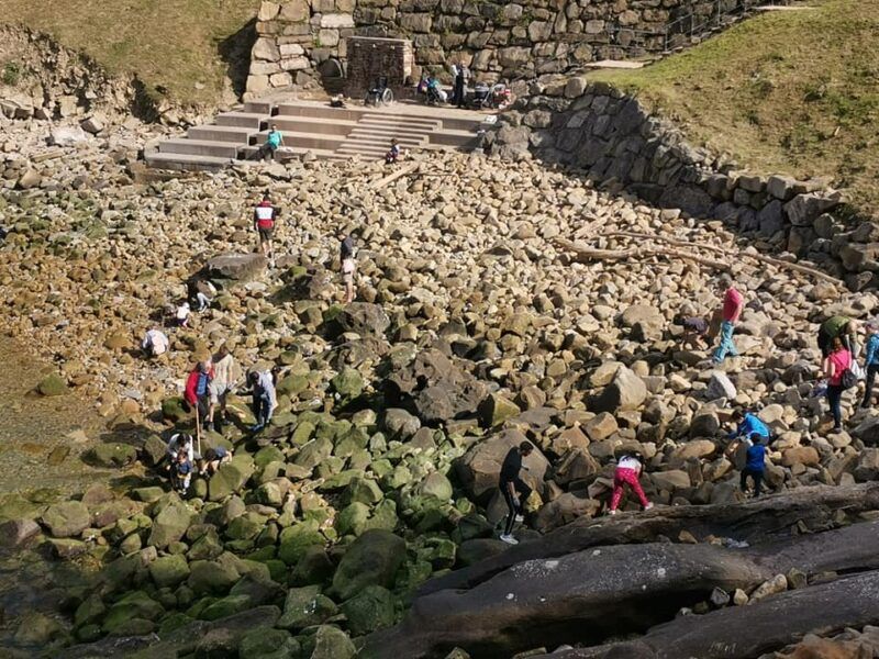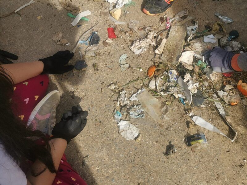 A las once de la mañana, 40 personas entre las cuales vimos un buen número de peques, se colocaron los guantes, cogieron sus bolsas y empezaron a buscar entre las piedras. Aunque aparentemente solo se veían algunos restos grandes de envases y redes, no tardaron en verse multitud de pequeños plásticos, envoltorios de txutxes, alguna mascarilla.