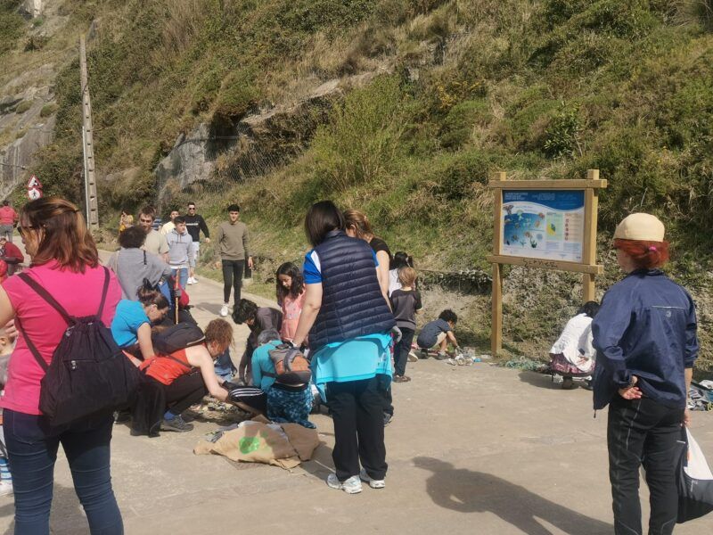 A las once de la mañana, 40 personas entre las cuales vimos un buen número de peques, se colocaron los guantes, cogieron sus bolsas y empezaron a buscar entre las piedras. Aunque aparentemente solo se veían algunos restos grandes de envases y redes, no tardaron en verse multitud de pequeños plásticos, envoltorios de txutxes, alguna mascarilla.