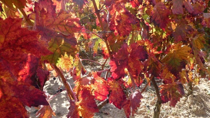 La clorofila es uno de los principales pigmentos que podemos encontrar en las hojas, es la causante del color verde. Con la llegada del otoño, y ya sin frutos la planta deja de producir clorofila. Esa falta contribuye a que otros tintes acaparen las viñas adornándolas con esos magníficos colores que no dejan a nadie indiferente.