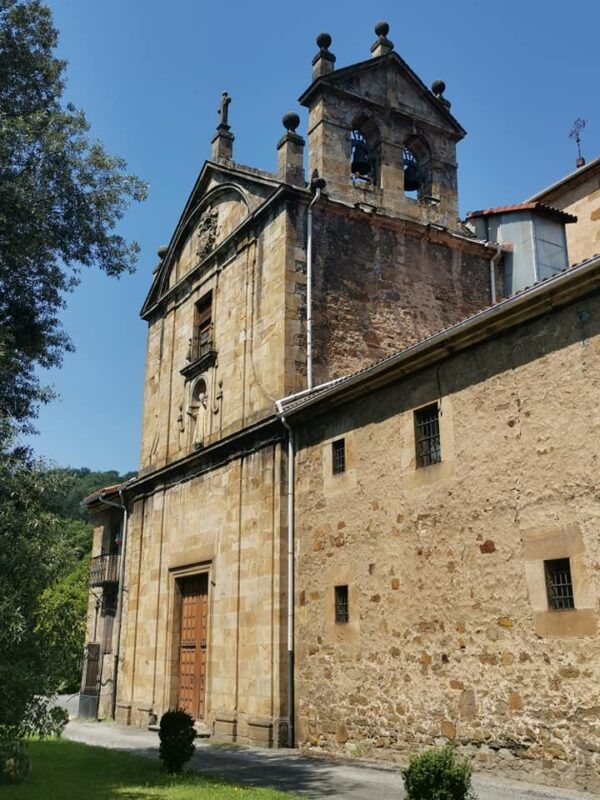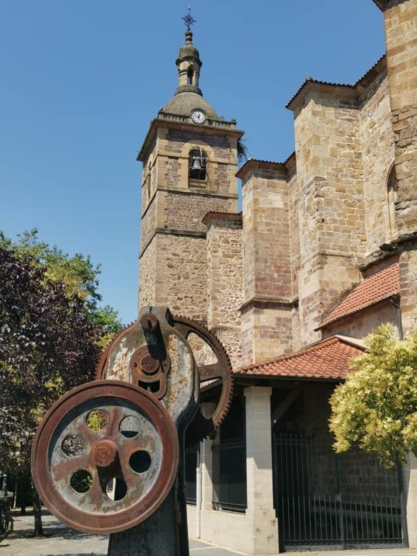 Muy cerca, la parroquia de San Miguel, obra del gótico tardío, templo de una sola nave siguiendo el modelo Hallenkirche, Iglesia de salón, bastante frecuente en Gipuzkoa, como en la Iglesia de Segura. En su entrada, el recuerdo a las ya desaparecidas forjas Albisu (1848-1990), con sede en Lazkao, como vemos en la foto.