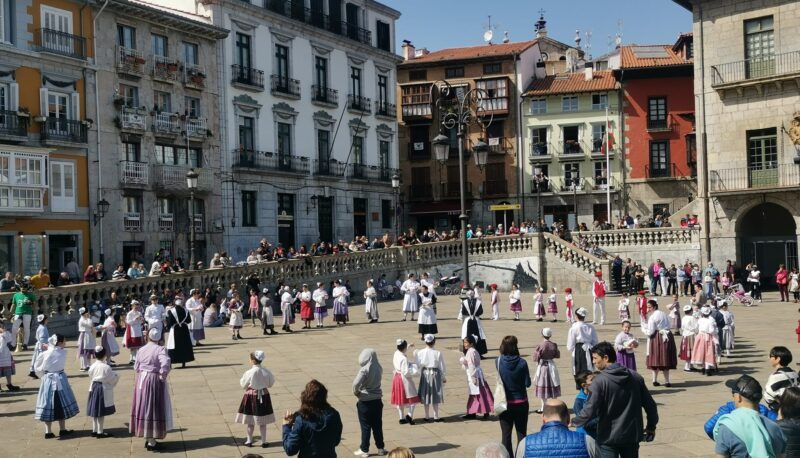 Nos recibió Lekeitio en un día de sol, cielo azul y buena temperatura, lo que hizo que nuestra visita fuera muy agradable, baño incluido en la playa de Karraspio que en la bajamar casi tocaba la isla de Garraitz o San Nicolás. Ambiente festivo, pues a mediodía vimos el desfile de la tradicional fiesta de nodrizas y pastores, iñude eta artzaiak, llenando de colorido la Plaza de la Independencia y su blanco kiosko.