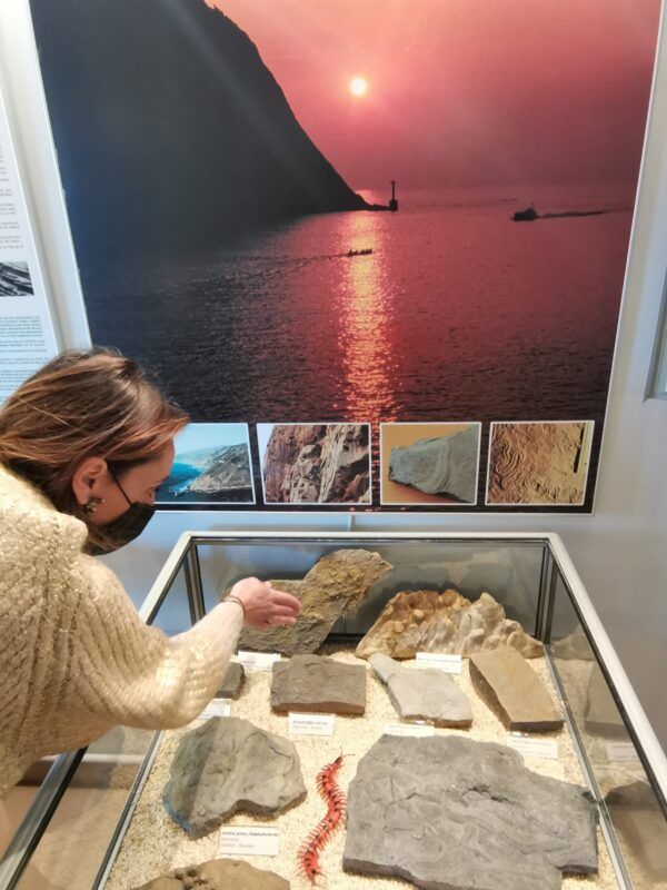 - La geóloga Ane Sedano, nos enseña un buen número de piedras y fósiles bajo una foto de la bocana de Pasaia.