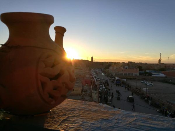 Y de nuevo el atardecer, así que subo a la terraza panorámica del Hotel Panorama, en la misma plaza, a saborear un café ( muy rico en Marruecos ) mientras Mostapha me contaba alguna cosilla del país. La última luz del día se escondía sobre el mismo zoco de Rissani.