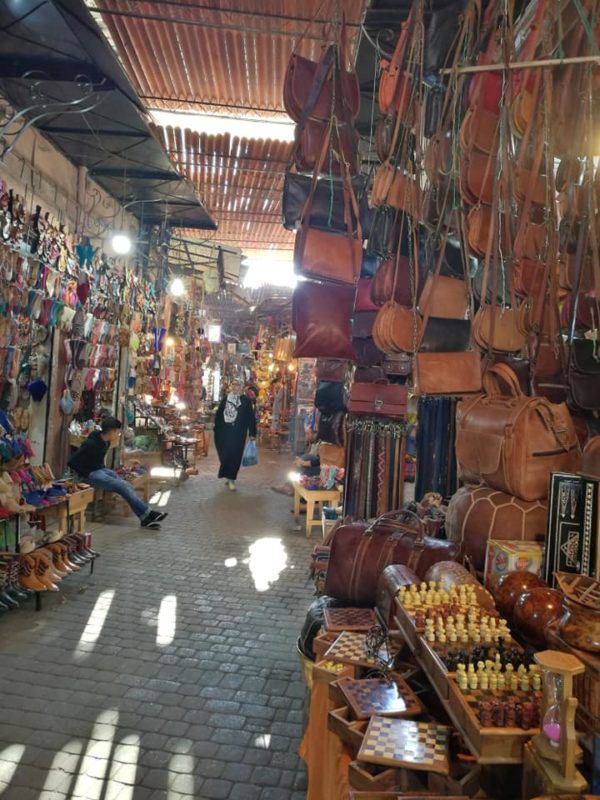 De nuevo las calles se estrechan, las tiendas se amontonan y perderse es fácil. Pero disfrute del juego del regateo, de los colores de las tienditas, música, artesanía, pieles, telas, sedas, dátiles, mandarinas. En el interior casas bellas por dentro pues la costumbre dice que no hay que dar envidia al vecino, como el Palacio Bahía repleto de detalles ornamentales. Más placitas dentro del zoco entre calles imposibles. Hay que decir que el zoco en realidad no es un lugar para el turista. Se mantiene tal cual para los propios ciudadanos donde realizan sus compras desde cientos de años. El turista lo visita y pasa a formar parte del paisaje. Un buen recorrido podría empezar por la Plaza Jema a la latura del Café de France camino del Shouk de Tapis que los miércoles tiene subasta, luego el Shouk de sacotiers, el de carpinteros, tejedores…