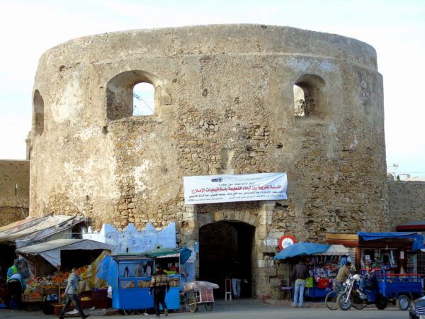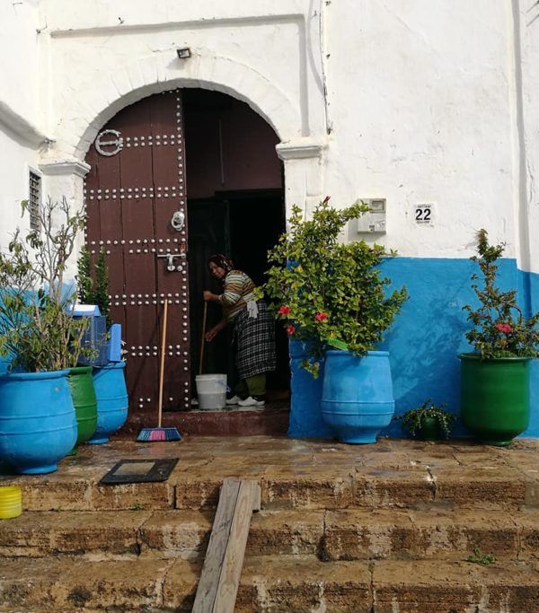 Nuestro guía la llamaba la Santorini de Rabat y no es para menos ya que en lo alto de una pequeña colina serpentean cuidadas callejuelas en blanco y azul con pequeños comercios hasta alcanzar una terraza panorámica desde la que se divisa una gran playa escenario de competiciones de surf, la entrada al puerto repleta de pequeñas embarcaciones y la separación a ambos lados de la ría de los dos barrios de Rabat.