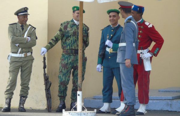 Llama la atención la cantidad y variedad de soldados que pueden verse por Marruecos. Y hasta cinco diferentes en la entrada del Palacio Real de Rabat. Recintos militares vigilados por un soldado hasta cada cincuenta metros. Dicen que el servicio de inteligencia de Marruecos es el mejor del mundo. Entre tanto militarismo, sorprende ver a la Guardia Real que custodia el Mausoleo de Mohamed V en Rabat, con sus casacas rojas, dejarse fotografiar por los cientos de turistas y sonreir. En la entrada al Palacio Real de Rabat encontramos esta amena reunión de militares hasta con cinco trajes diferentes…