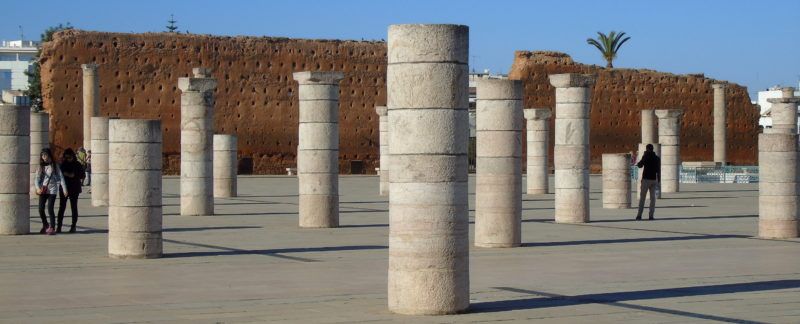 Un recinto luminoso custodiado por soldados de la Guardia Real a caballo forma la explanada de la Torre Hasan, construída con intención de ser la Mezquita más grande del mundo tras la de Samarra en Irak. La torre debía medir más de 80 metros pero se quedó en 44 aunque se le llame la hermana gemela de la Giralda de Sevilla y la Kuttubiya de Marrakech. Un patio de columnas romanas traídas desde Volubilis que se quedaron a mitad de altura por el terremoto de Lisboa de 1755, uno de los más grandes que se recuerdan.