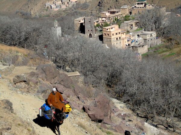 El camino sigue sinuoso hasta la aldea de Imlil, a 1500 metros de altitud. Un pequeño Tíbet con tienditas pensadas para el montañero a la vista de cumbres nevadas sobre piedra negra o grisácea donde se pegan más aldeas con el burro como medio de transporte. Vida casi imposible. Un trekking de un par de horas llevó al grupo por un sendero retorcido que cada vez ganaba más altura. Las vistas, inolvidables. Un cielo azul impoluto, cumbres blancas, laderas grises, aldeas de barro que parecen desintegrarse en el paisaje.