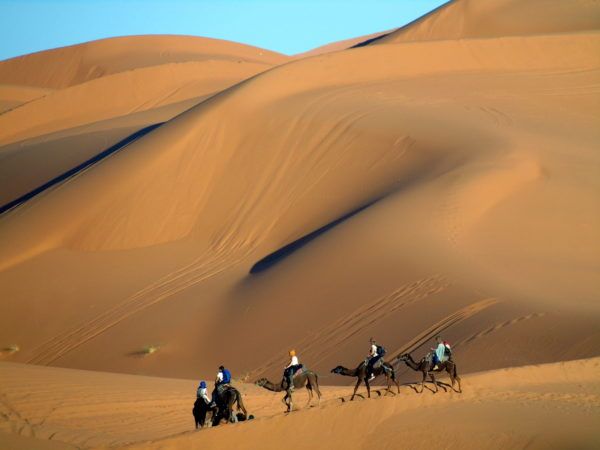 Cuidado con las temperaturas porque en invierno el sol puede subir la temperatura a 20-24 grados aunque a la noche llegue a bajo cero. Hay que pensar que este desierto está a 900 metros de altitud. El juego de luces y sombras en las dunas es infinito, con la estampa de camellos, nómadas, quads y excursionistas que en grupo montan sus haimas.
