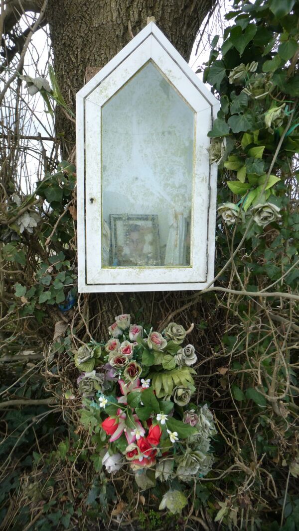 Primero alcanzamos el caserío Parada, clásico y antiguo pero con un adosado moderno. En su cercanías encontramos la referencia de la cumbre, una pequeña capilla, a la izquierda, sujeta a un árbol, en memoria de un joven, con una virgen María y un San José con niño.