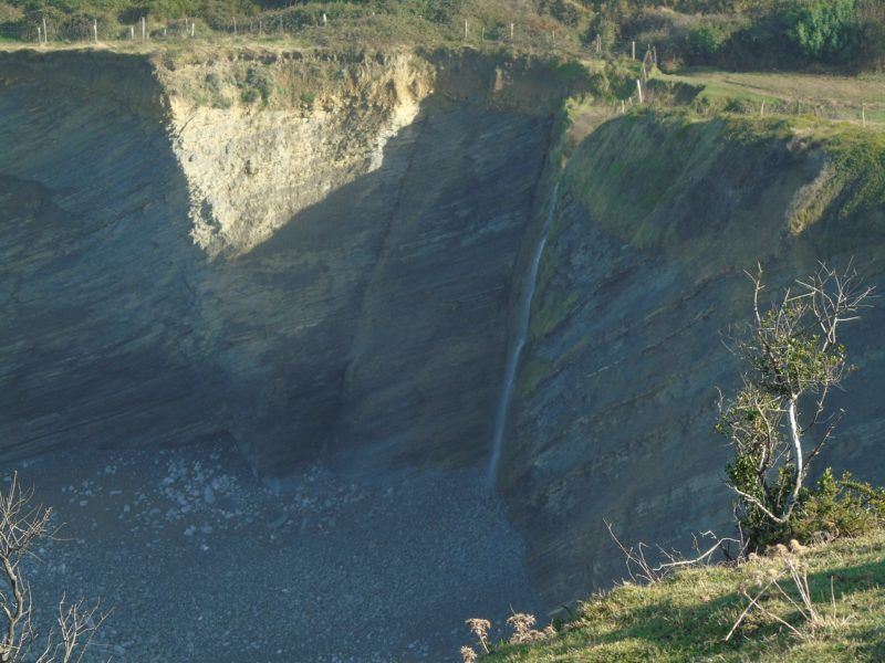 Con un buen zoom alcanzamos el barrio de Askizu al fondo con las paredes de Itzurun y hasta casas de Zumaia. Un atardecer de Abril a Septiembre desde aquí será algo para apuntar pues el sol caerá sobre la línea del horizonte. En invierno tuvimos la suerte de ver la cascada de Mendata alegre como pocas veces.