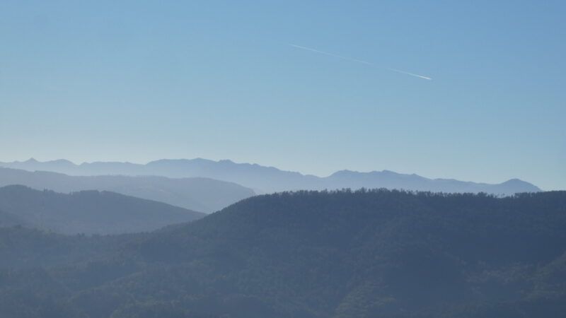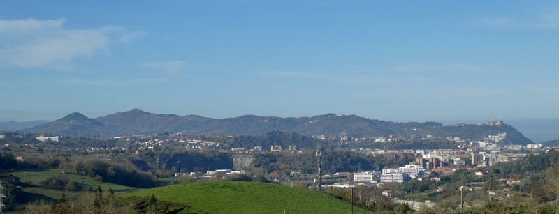 Desde ciertas terrazas, entre todas las lomas cerrando el horizonte destacan la pirámide de Arratzain y el cónico Mendizorrotz, con sus numerosas antenas y separados por el Artikulako lepoa.
