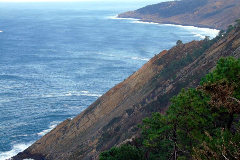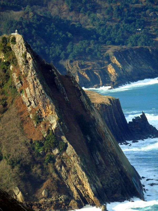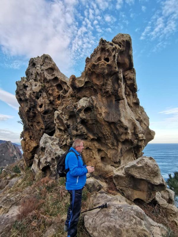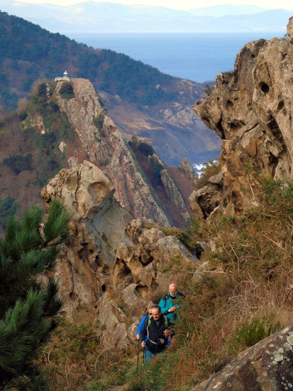 Siguiendo el camino evidente con cuidado y con la ayuda, si hiciera falta, de varios tramos de pasamanos, superamos la Bancha del Este, conocida popularmente como Cresta del Gallo, viendo erosiones y geoformas muy bonitas, con grandes vistas a Pasaia y a los acantilados del Faro de la Plata y Ulia.