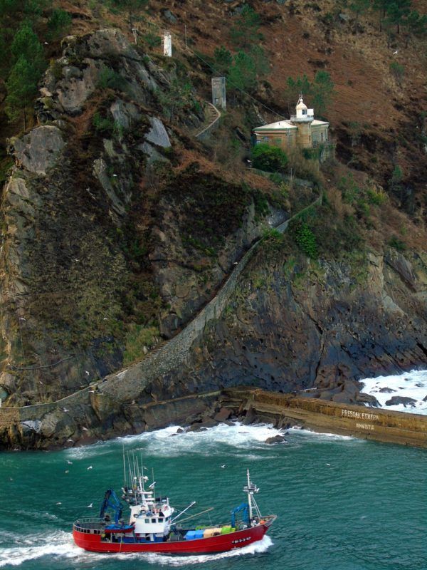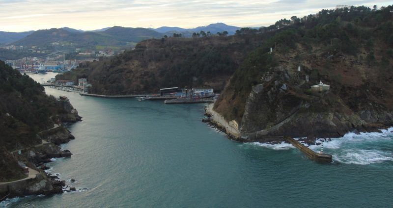 Vemos a Javier Mitxelena atacando la rampa de fuerte desnivel con la suerte de ver bellas imágenes aéreas del Faro de Senekozuloa cuyas escaleras vertiginosas bajan desde la zona del Faro de la Plata y, a medida que ganamos altura, la gran bahía pasaitarra donde cargueros y pesqueros salían y entraban sin descanso.