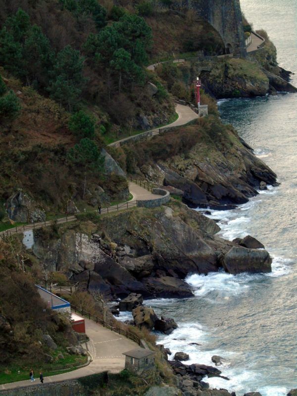 Ya en San Juan cruzamos la Plaza Santiago, el arco y el Castillo de Santa Isabel hasta llegar a la Cala Alabortza donde sale la pista de cemento que nos leleva hasta el gran semáforo de la bocana de Pasaia. En el cruce tomamos la pista de la izquierda que sube hasta dicho semáforo.