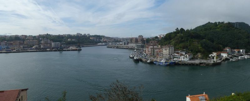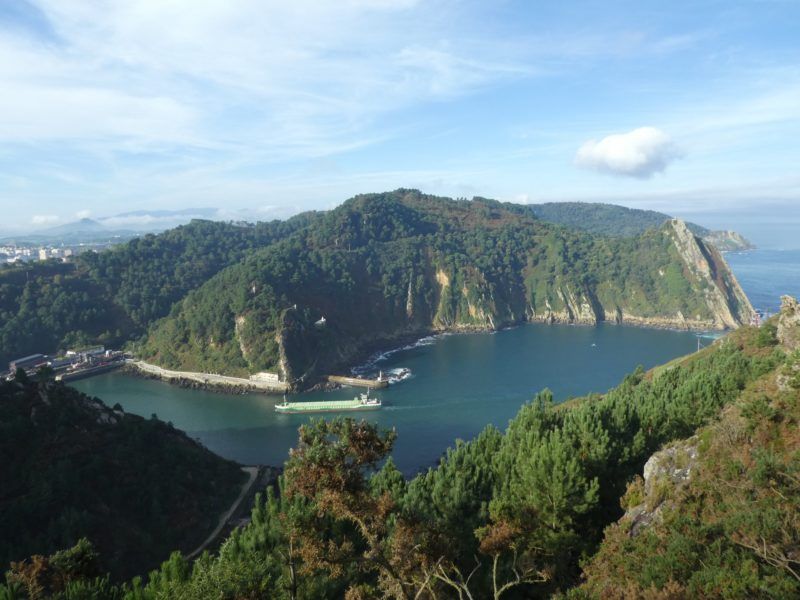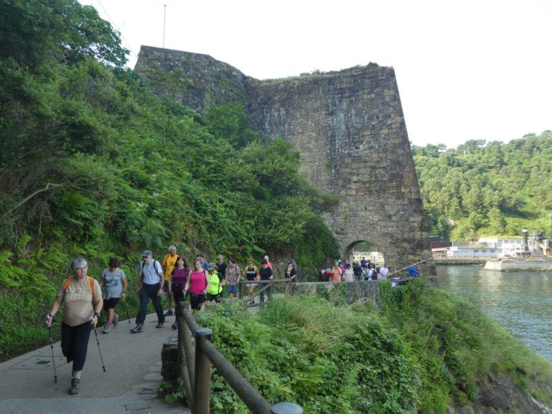 Justo allí, regresando y a la derecha salvando una “ataka” nace un estrecho sendero desconocido que llega hasta la pista hormigonada, (que es camino de Santiago, con marcas amarillas), que desciende rápidamente hasta Pasai Donibane. También puede retrocederse y tomarla en la bifurcación a la derecha. Después, sobre la bahía, el senderista girará la izquierda hacia el señalizado albergue de peregrinos, hasta la ermita de Santa Ana, otro prestigioso mirador de la bahía, para por unas empinadas escaleras, descender al embarcadero de la motora a Pasai San Pedro.