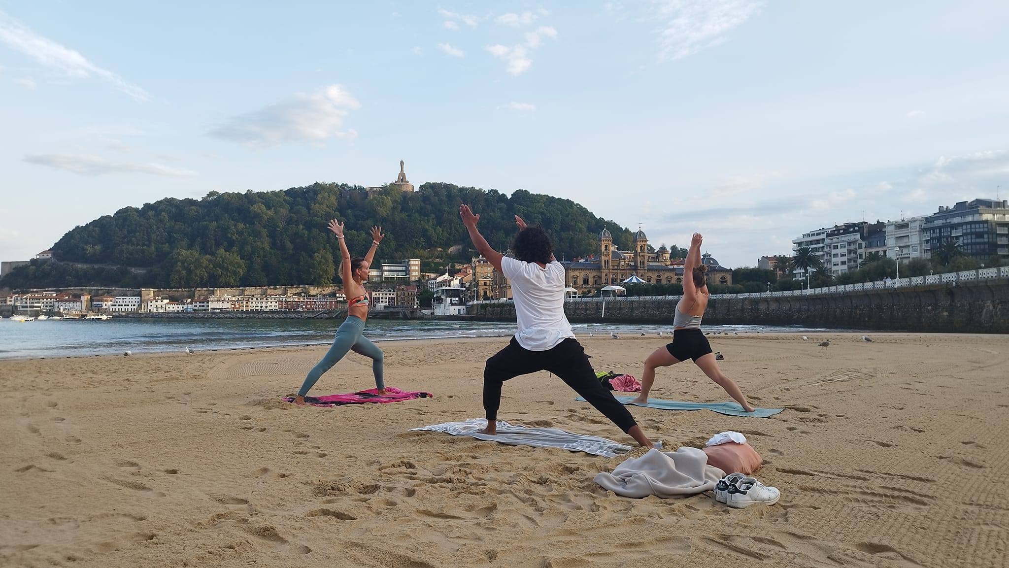 San Sebastián ya tiene un par de veces por semana sesiones de yoga en la bahía de La Concha. Mejor escenario difícil como vemos en la fotografía de portada.