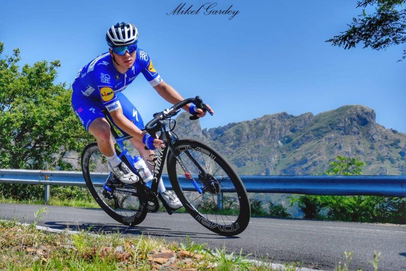 - Evenepoel bajando de Erlaitz con la Peña de Aia al fondo. Foto: Mikel Gardey.