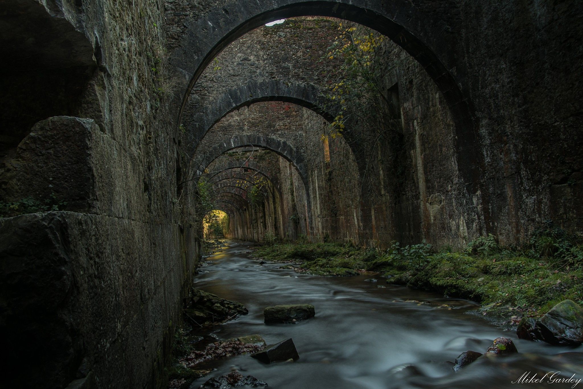 Desde Aribe sigue la carretera asfaltada otros siete kilómetros hasta el propio pueblo de Orbaizeta, muy bello desde la propia carretera , pero continúo otros seis kilómetros hasta llegar a la Fábrica. No hay nadie. Lugar sombrío, alguna casa rehabilitada de los antiguos trabajadores y un bar. Para sacar la típica arcada tantas veces fotografiada bajo por un evidente senderito de apenas unos metros, hasta pasar por debajo del puente. Si ya el silencio impone, ver los arcos, el susurro del río y una pequeña surgencia que brota de la pared del túnel, invita a pensar en algo más que gnomos.