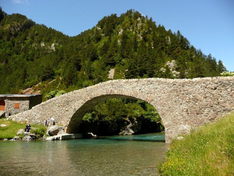 Seguí durante diez kilómetros castigando los bajos del coche hasta llegar a otro pequeño paraíso, el refugio de San Nicolás de Bujaruelo con su puente sobre el río Aras, puerta del suave viento que baja del valle. Un merendero me invita a comer ahí o tomar un café y me tentará la suerte de darme un chapuzón en las heladas aguas bajo el puente donde si hay agua de sobra incluso algún niño se tira sin miedo. Prueba a bañarte y comprenderás porqué los deportistas toman baños de hielo.
