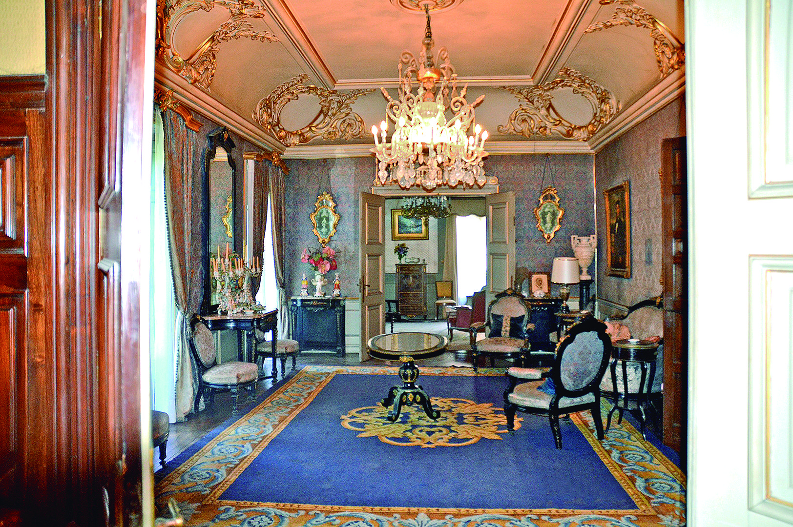 Por una escalera se accede a la capilla y en el mismo hall se abre un pequeño bar con decoración de los años 30 en paredes de charol rojo. Los salones nobles con vistas a jardines y río. Las cuatro habitaciones » en enfilada » comunican entre sí por puertas dobles, comedor, despacho, salón y gabinete que al unirse crean un gran espacio adecuado para fiestas con muchos invitados.