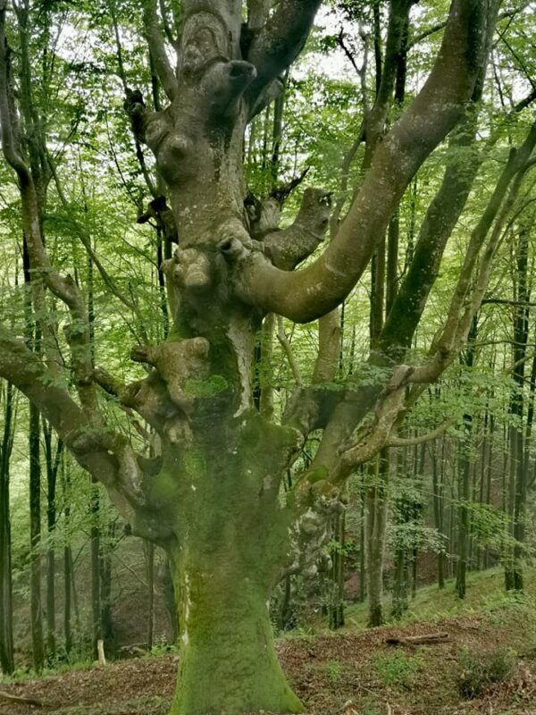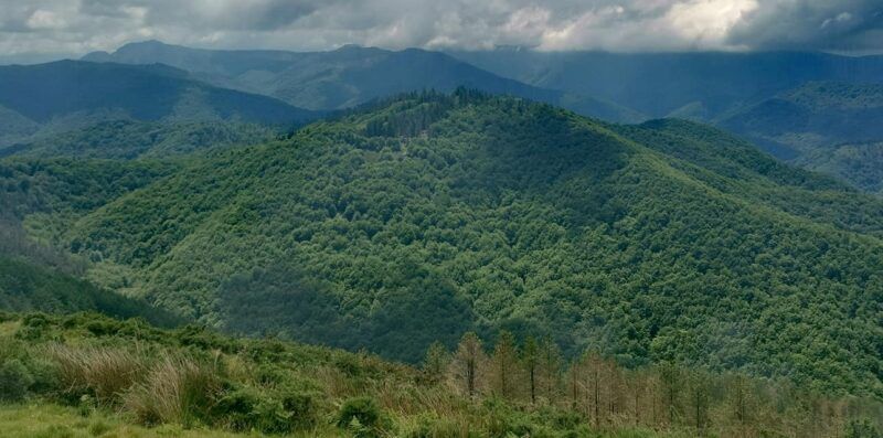 Por el viejo trazado del ferrocarril Artikutza – Rentería (impresionante obra de ingeniería) y de nuevo entre bosques de grandes hayas trasmochas, riachuelos y algún túnel, alcanzamos, no sin esfuerzo, las cercanías del collado Bionditz.