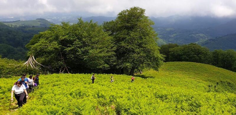 El entorno de la ruta, de aproximadamente cuatro horas y media, invita a lo mejor pues se desarrolla en el gran parque natural de la Peña de Aia, Aiako Harria, un frondoso bosque de más de 100.000 hayas trasmochas que adoptan misteriosas formas, en una época del año en la que desde su base hasta la copa se visten de un espeso musgo. Toda la zona es además muy rica en prehistoria pues encontraremos numerosos crómlechs como el espectacular de Oianleku.
