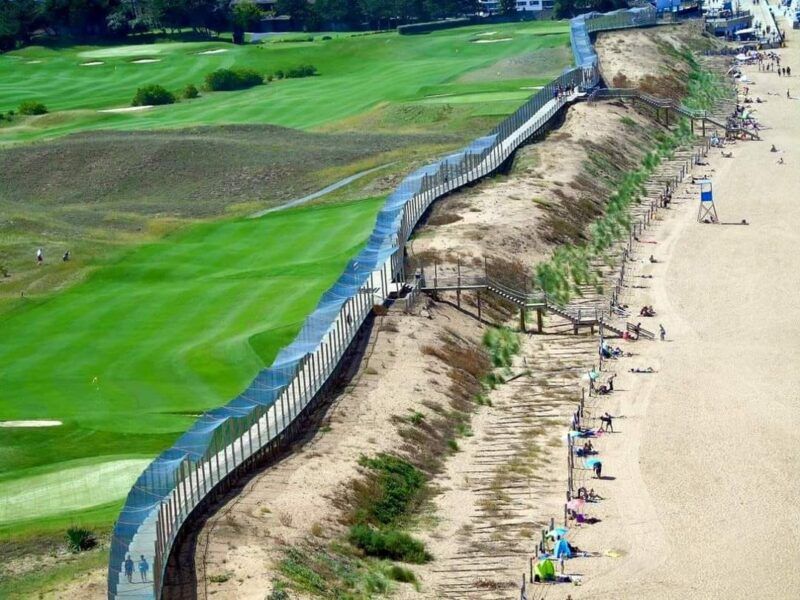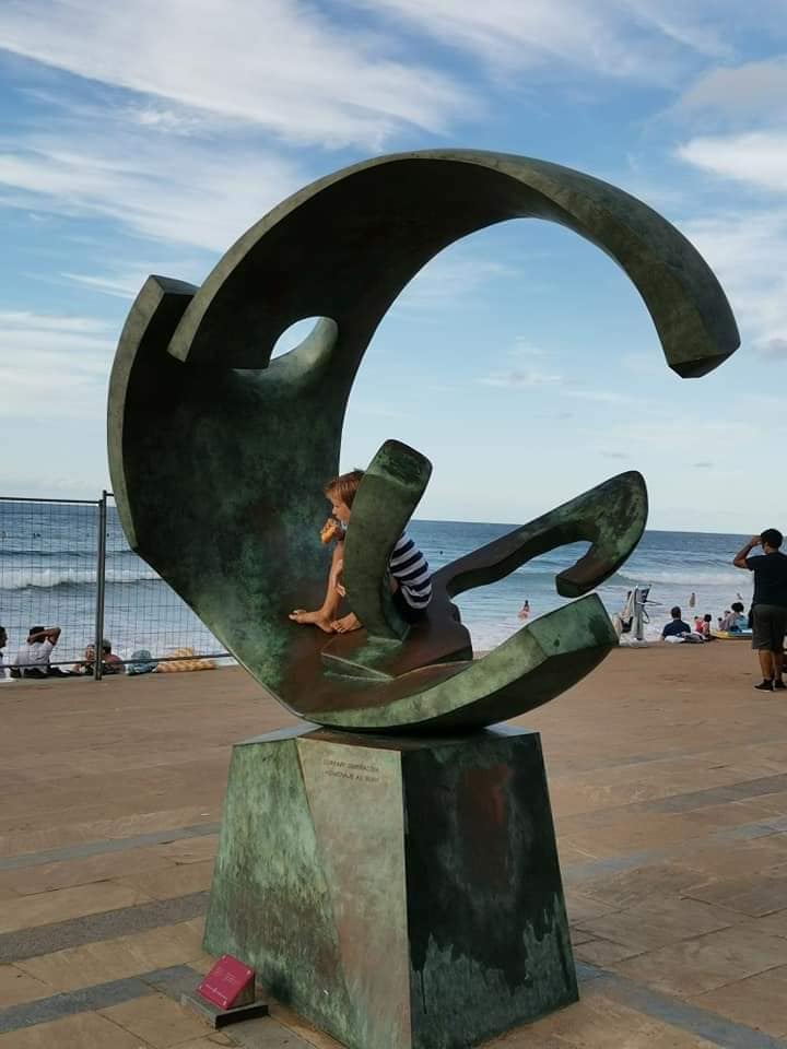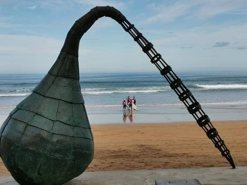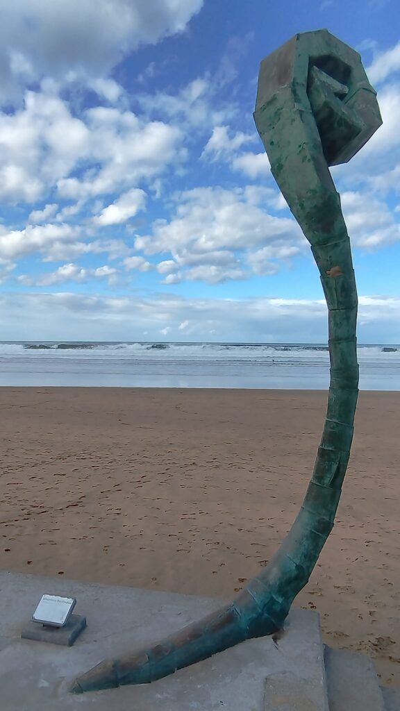 Seguimos ahora bordeando un arenal con canchas de vóley hasta llegar al restaurante del gran chef Karlos Arguiñano, también con su escultura, y llegar al parque infantil. Al final del paseo y antes de la pasarela de madera del golf veremos la última escultura.