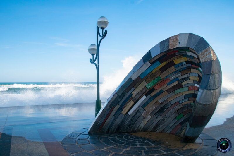 Bajamos ahora al paseo por el voladizo, siempre y cuando las olas lo permitan para ver la siguiente escultura, muy vistosa, y posiblemente la más fotografiada por sus colores.