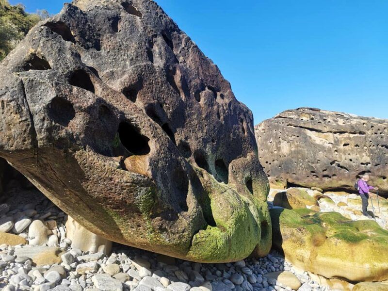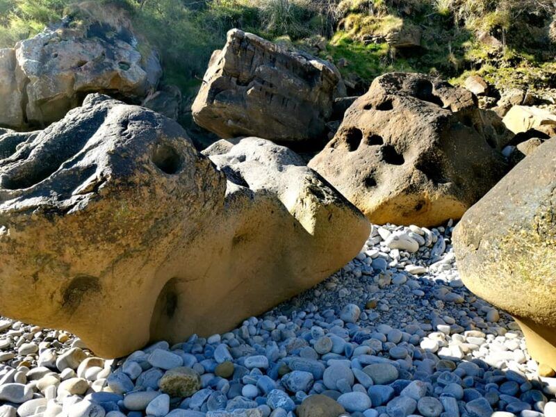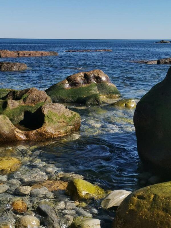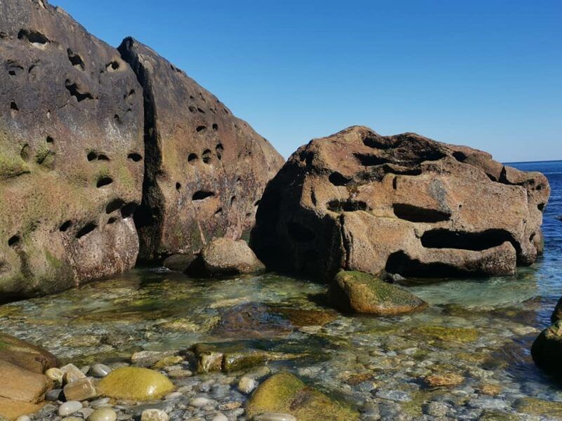 Entre alguna zarza y el «refugio de Robinson Crusoe», no fue muy complicado llegar hasta la cala repleta de cantos rodados y rocas muy curiosas, entre ellas «la partida por el rayo». Con la marea baja resultaba muy tentador el baño.