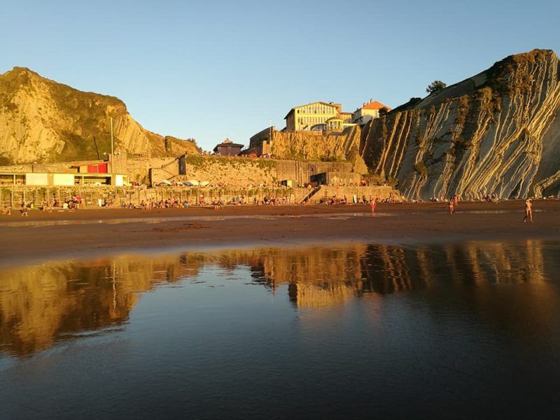 Imprescindible. Zumaia y los flysch del geoparque, zona que abarca Zumaia, Deba y Mutriku. Las maravillas de nuestra costa. En verano el sol se pone justo enfrente de la orilla mientras todo el acantilado de flysch se viste de naranja.