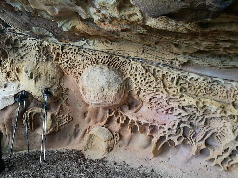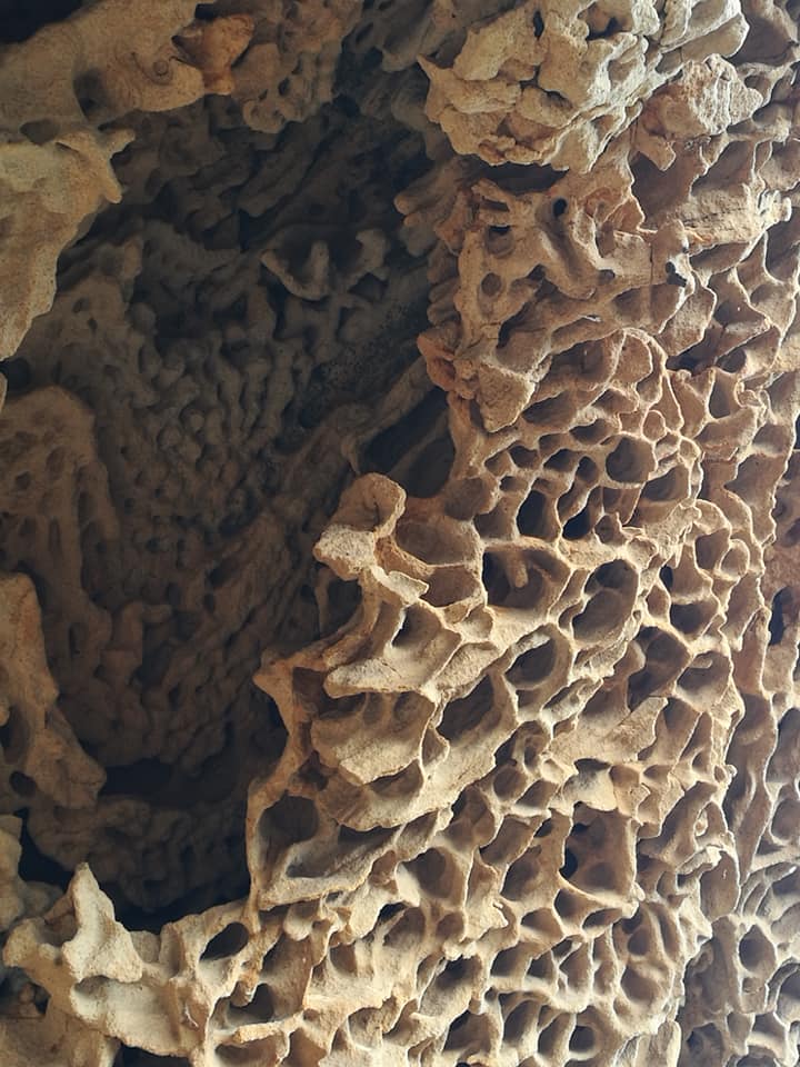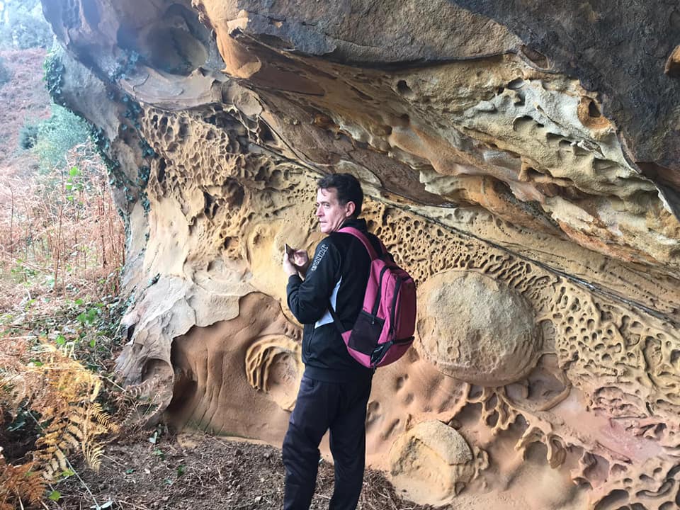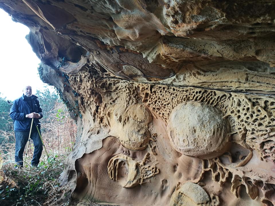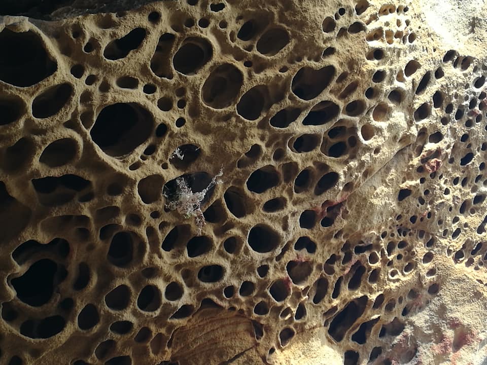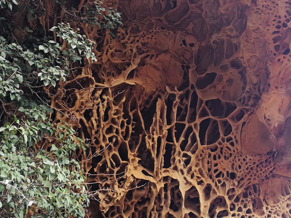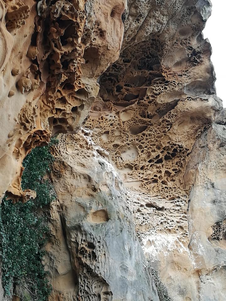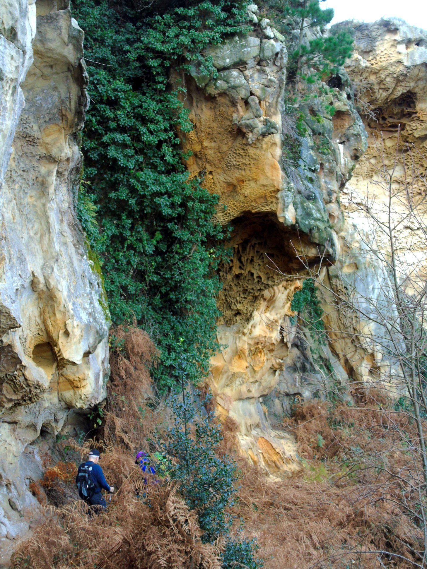 Pero el enrevesado laberinto continuaba felizmente con Enrique abriendo paso. Otra cosa hubiera sido impensable. Zarzas, barro, helechos gigantes… ocultaban el camino. A la derecha el valle que nos lleva hacia la Catedral, los buitres cada vez más cerca seguían trazando círculos quizás inquietos por entrar en su terreno. Y de pronto, gigantescas cuevas colgadas al valle, pintadas de colores y talladas en panales y medallones que provocaron el éxtasis en los visitantes. Parece mentira que estas obras de arte sean productos de la erosión.