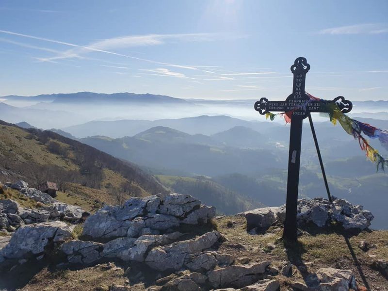 Veremos en la cumbre la inconfundible gran cruz que remata esta montaña. Con el sol apagando el día será otro momento inolvidable dando por terminada la ruta de hoy. De Hernialde, o de Tolosa mismo tan solo nos quedarán 25 kilómetros por la autovía pero tampoco sería mala idea volver a Tolosa, cenar y seguir paseando tranquilamente por sus calles llenas de ambiente.