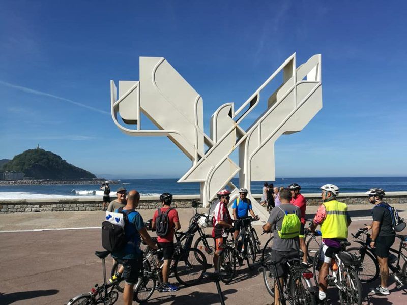 El recorrido que el sábado 22 de Septiembre de 2018 iniciaron a modo inaugural cerca de 60 ciclistas incluido el simpático americano de Oregón, Michael J. Fox que iniciaba así en su vuelta por el mundo toda la transpirenaica en bicicleta, no pudo ser mejor en un día soleado y sin viento. Tras las palabras de bienvenida del incansable promotor Jesus Mari Alquézar nos pusimos en marcha desde la terraza del Ayuntamiento en Alderdi Eder. El propio Jesus Mari viendo cumplido su sueño abría paso por el bidegorri del Paseo de La Concha. Espectacular. La bahía, la barandilla, La Perla, la Plaza del Bicentenario, el Palacio de Miramar, el túnel de Ondarreta… hasta alcanzar la obra de Chillida, el Peine del Viento, posiblemente el icono de Donosti más fotografiado.