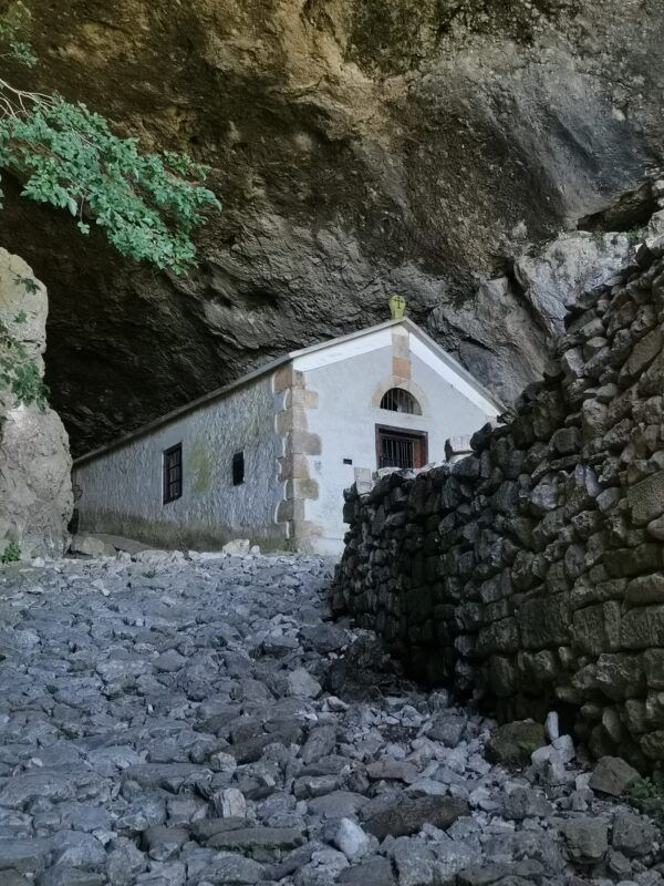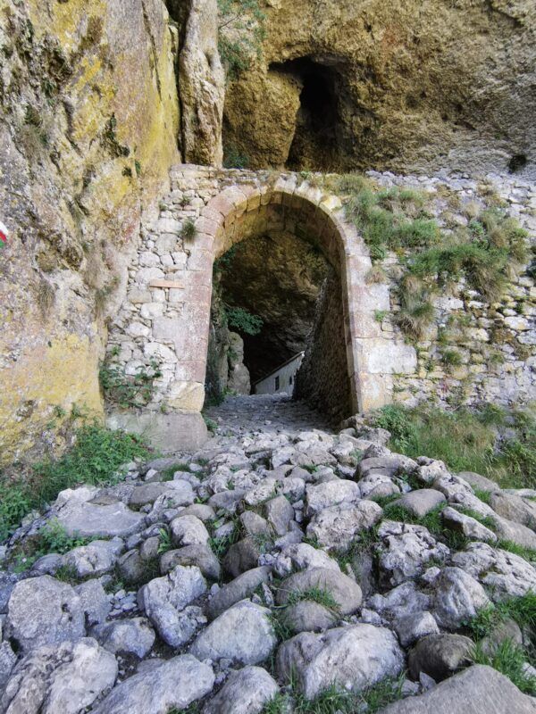 Ya girando hacia la izquierda entro en la calzada romana donde poco a poco van notándose los márgenes hasta llegar a una oquedad en la pared. Es el paso o cueva de San Adrián que tantas ganas tenía de visitar, así que dedico un buen rato a cruzarla una y otra vez buscando algún ángulo bueno para fotografiar. Una gran puerta en forma de arco invita a pasar al otro lado donde el paisaje vuelve a abrirse mucho.