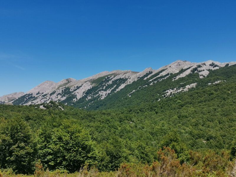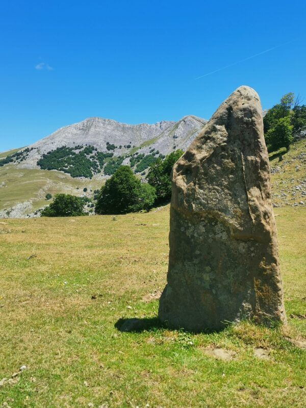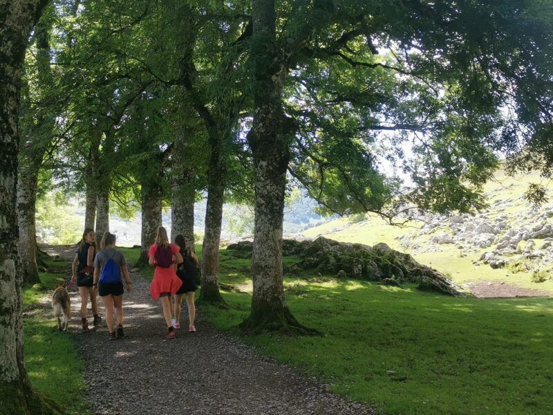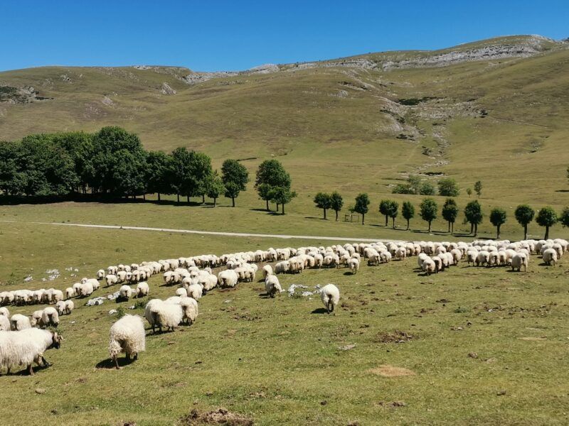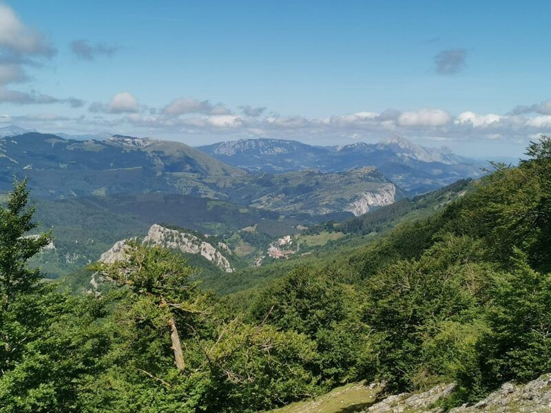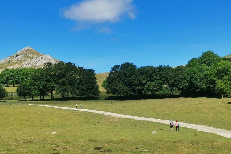 Enseguida pasa a dominar el blanco paisaje kárstico de Urbia, con prados verdes infinitos, ovejas, caballos y grandes hayedos. Un espacio abierto, llano dominado por las tres cumbres: Aitxuri, Aketegi y Aizkorri. Espectacular.