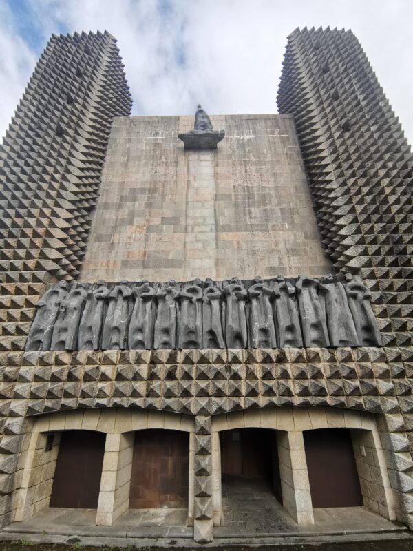 La sencilla fachada presenta la Piedad y los 14 apóstoles de Oteiza, aunque él mismo dijera que eran los catorce remeros de Orio.