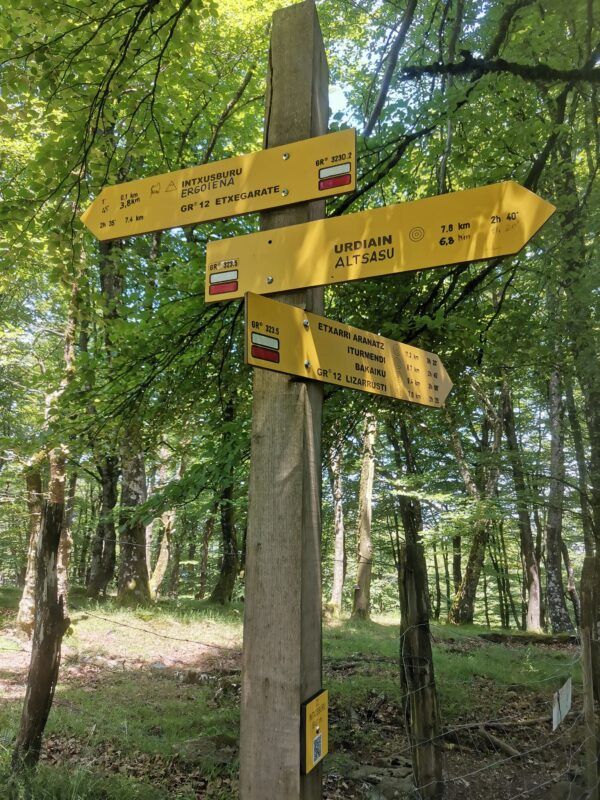 Muy atento a las señales que desvían por mil vericuetos llego por la parte alta del bosque hasta Argonitz (932), Irumugarrieta (961) y Zelatamuño (960) para bajar derecho durante 1.500 metros hasta el albergue de Lizarrusti (610).