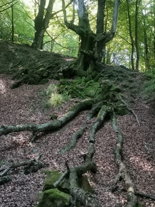 Junto a la casa empezamos a subir hasta la altura del dolmen de Igartza, oculto por la vegetación. Unos 45 minutos de esfuerzo que compensan las vistas al terminar esta ladera y entrar en el hayedo de Altzania.