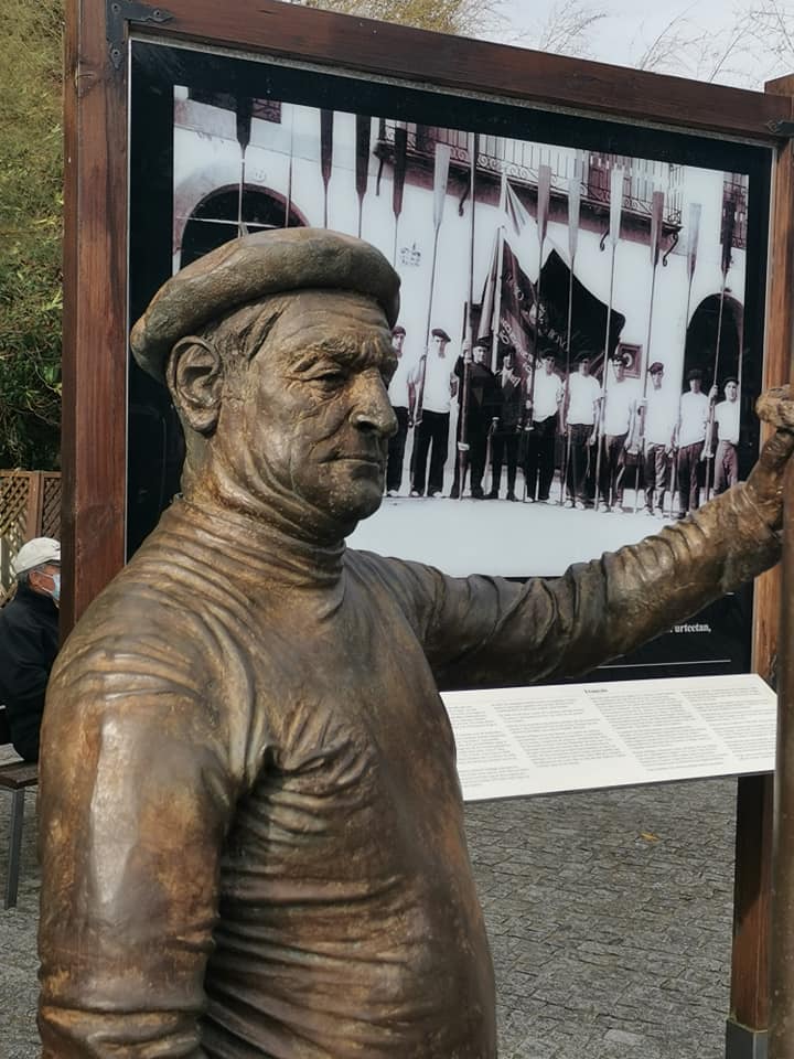 De nuevo en el embarcadero, veo la escultura de Aita Manuel, leyenda del remo pasaitarra y vasco en general, ganador de diez banderas de La Concha con el récord de seis consecutivas en los años veinte del pasado siglo. No solo Manuel, sino también seis familiares suyos lo hicieron como remeros. La escultura de Zigor García refleja muy bien la importancia del remo en esta localidad donde la rivalidad San Pedro vs. San Juan ha llegado a cotas altas.